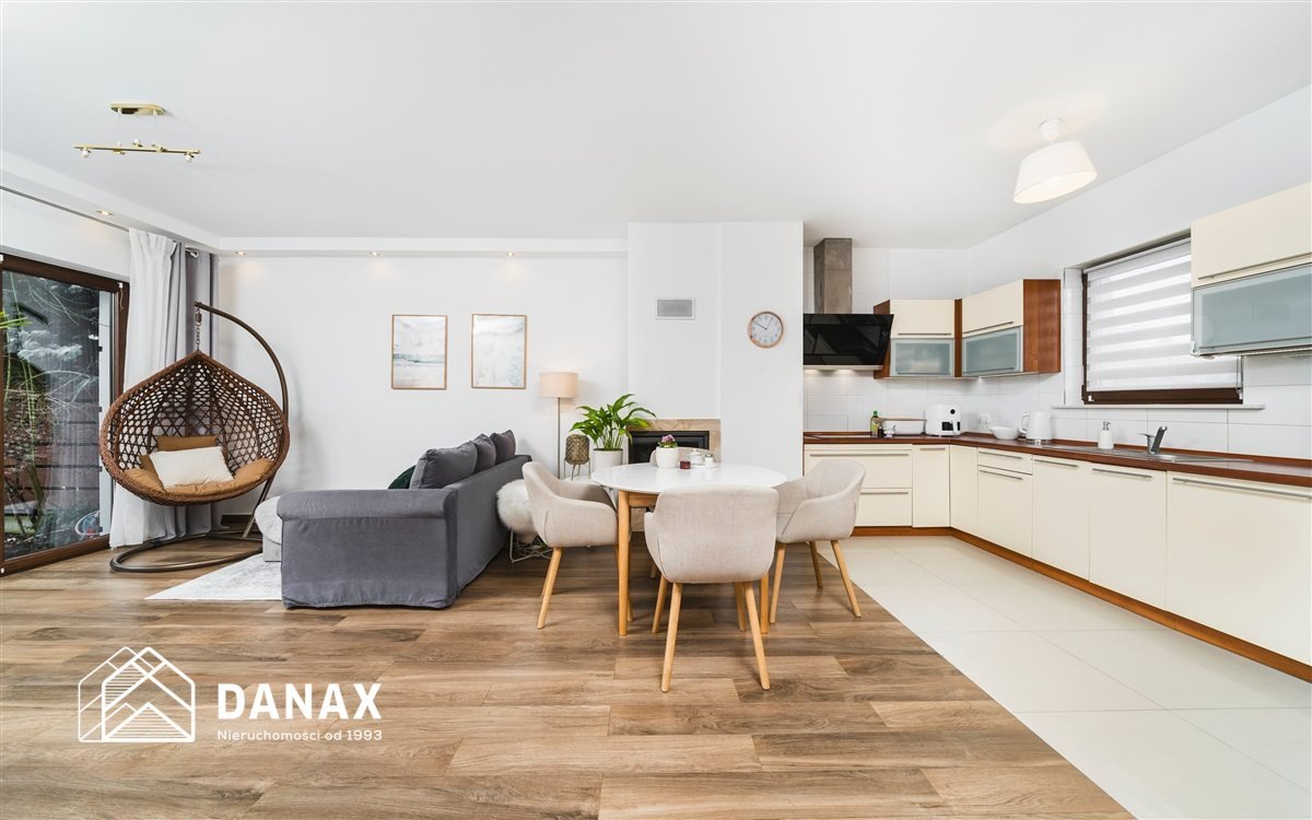 Apartament o powierzchni użytkowej 112,94 m2, z 2016 roku, gotowy do wejścia i wykończony w wysokim standardzie. Z salonu jest wejście na piękny, zadbany ogród. Z dwóch pokoi na pierwszym piętrze jest wyjście na duży balkon. Wyjście na balkon oraz ogród jest od strony południowej. Okna drewniane nowego typu. Dach jest z blachy. Ogrzewanie i ciepła woda - piec gazowy dwufunkcyjny. Na podłodze w pokojach są panele, natomiast w przedpokoju, kuchni i łazienkach są płytki. Kuchnia jest wyposażona w: lodówkę, zmywarkę, płytę indukcyjną, piekarnik, okap i mikrofalówkę.