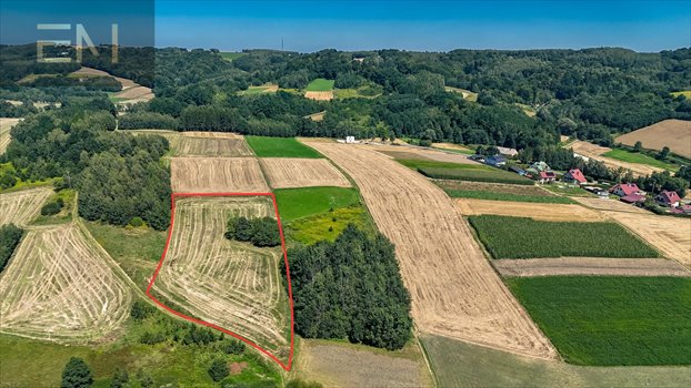 0,65 ha w kształcie prostokąta o bokach ok. 56x116m przy drodze gminnej nieutwardzonej.