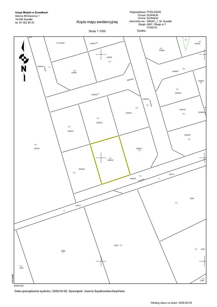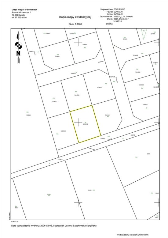 oznaczona działką nr 31946/16 o powierzchni 0,1159 ha, niezabudowana, położona w Suwałkach w Obrębie nr 7, wchodząca w skład nieruchomości oznaczonej księgą wieczystą nr SU1S/000pokaż telefon. Działka zgodnie z miejscowym planem zagospodarowania przestrzennego południowo - zachodniego rejonu ulicy Zastawie w Suwałkach zatwierdzonym Uchwałą LXVI/871/2024 Rady Miejskiej w Suwałkach z dnia 31.01.2024 roku, objęta jest konturem 6MNW - teren zabudowy mieszkaniowej jednorodzinnej wolnostojącej. Nieruchomość przeznaczona jest do sprzedaży w drodze przetargu ustnego nieograniczonego.