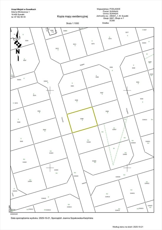 oznaczona działką nr 35388 o powierzchni 0,0853 ha, niezabudowana, położona w Suwałkach w Obrębie nr 7, wchodząca w skład nieruchomości oznaczonej księgą wieczystą nr SU1S/000pokaż telefon. Działka zgodnie z miejscowym planem zagospodarowania przestrzennego południowo - zachodniego rejonu ulicy Zastawie w Suwałkach zatwierdzonym Uchwałą LXVI/871/2024 Rady Miejskiej w Suwałkach z dnia 31.01.2024 roku, objęta jest konturem 11MNW - teren zabudowy mieszkaniowej jednorodzinnej wolnostojącej. Nieruchomość przeznaczona jest do sprzedaży w drodze przetargu ustnego nieograniczonego.