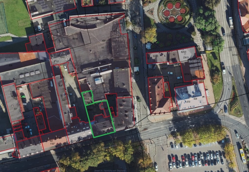 1. Działka nr 500/6 położona jest w centralnej części miasta, kształt nieregularny, zbliżony do prostokąta, sąsiedztwo bezpośrednie stanowi zabudowa mieszkaniowa wielorodzinna oraz zabudowa usługowa. Na działce znajduje się murowany, dwukondygnacyjny, dwulokalowy budynek mieszkalny o numerze ewidencyjnym 993. Ściany zewnętrzne murowane z czerwonej cegły ceramicznej, elewacja otynkowana, stropy drewniane belkowe, dach płaski pokryty papą, obróbki blacharskie z blachy ocynkowanej, stolarka okienna drewniana, kominy murowane. Łączna powierzchnia użytkowa dwóch lokali mieszkalnych wynosi 106,38 m2, a powierzchnia zabudowy 78 m2. Działka zabudowana w 100% (po tzw. obrysie). Budynek w złym stanie technicznym, liczne spękania oraz ubytki w tynku, widoczna cegła. Budynek aktualnie nieużytkowany.
