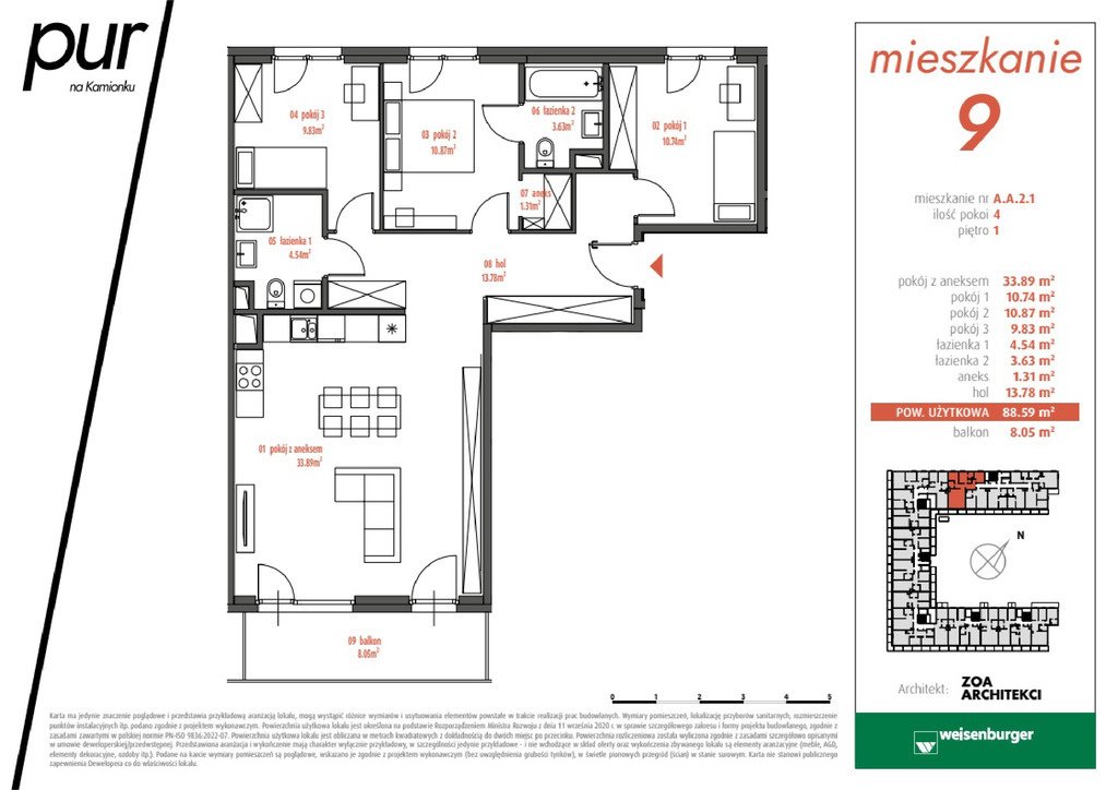 - salon z aneksem kuchennym łącznej powierzchni 33,89 m2 z wyjściem na duży balkon powierzchni 8,05 m2