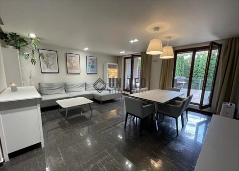 ogromnego salonu w pełni umeblowanego, ze strefą jadalnianą i wypoczynkową oraz telewizorem 55" — z bezpośrednim wyjściem na taras,