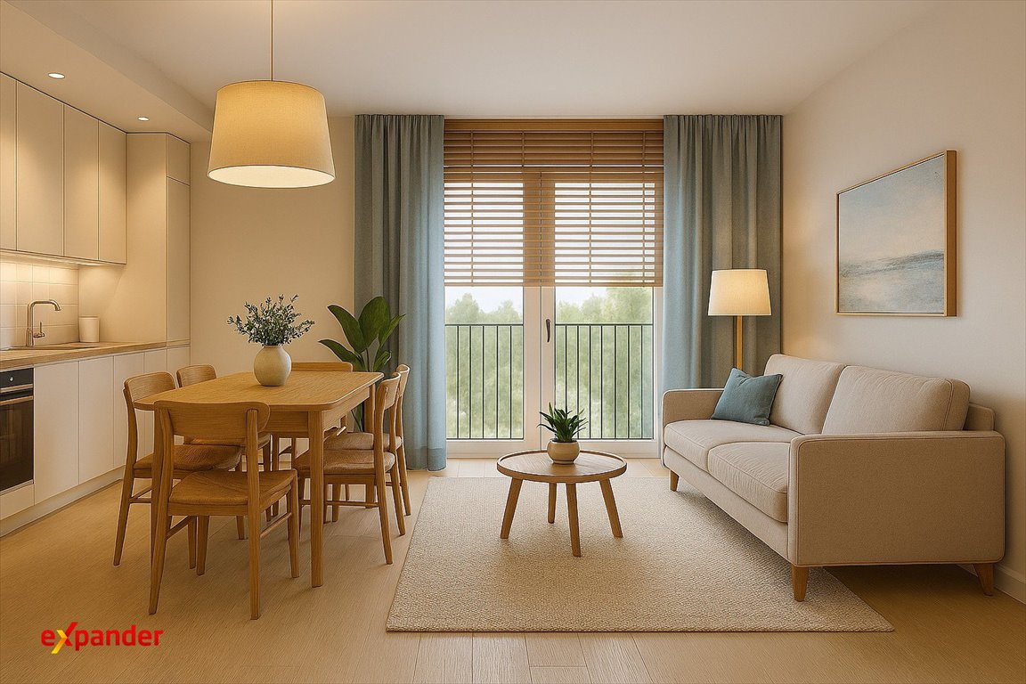 Jasna przestrzeń dzienna z miejscem na pełną zabudowę kuchenną. W salonie znajduje się wyjście na balkon o powierzchni 4,50 m², idealny na poranną kawę i wypoczynek na świeżym powietrzu.
