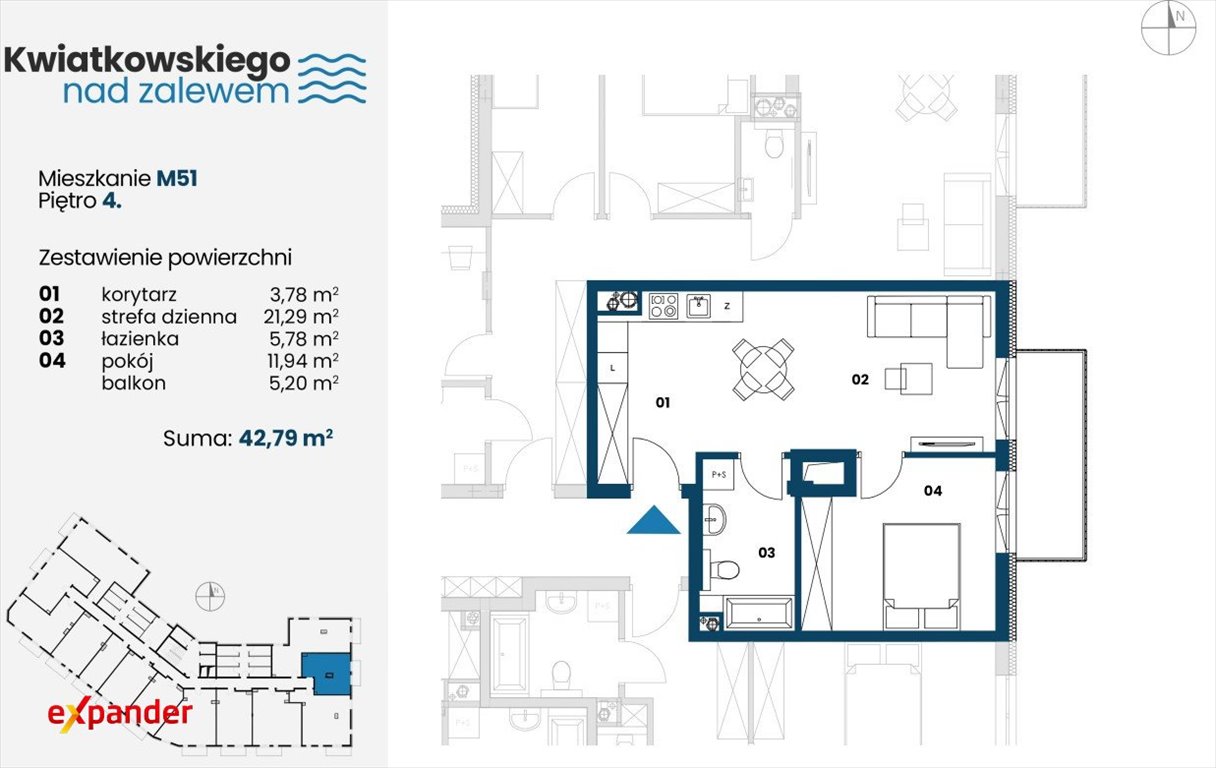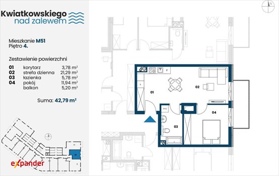 Apartament numer 51 o powierzchnii 42,79 m2, znajduje się na 4 piętrze nowoczesnego budynku na który składa się: