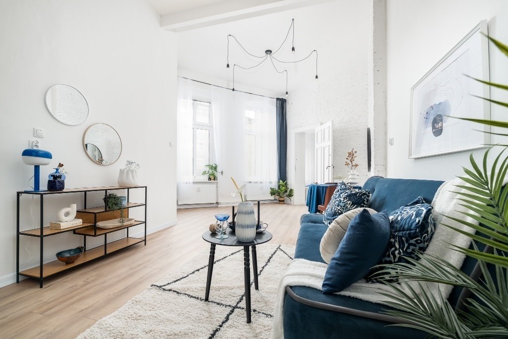 Wnętrze składa się z dwóch pokoi, jasnej kuchni oraz małej łazienki. Mieszkanie jest gotowe do zamieszkania, wykończone ze smakiem i utrzymane w dobrym stanie technicznym. Wysokie sufity i duże okna zapewniają wyjątkowe poczucie przestrzeni i naturalne światło przez cały dzień.