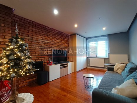 - przestronny salon z ceglaną ścianą