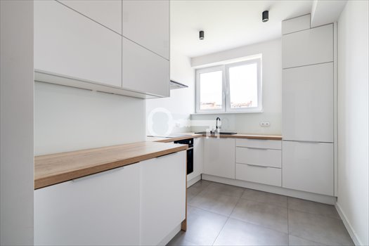 * Kuchnia - oddzielna, z oknem, w pełni wyposażona w nowoczesne meble na wymiar, piekarnik, płytę grzewczą i zmywarkę, minimalistyczna biel i drewniane blaty tworzą nowoczesny, minimalistyczny klimat.