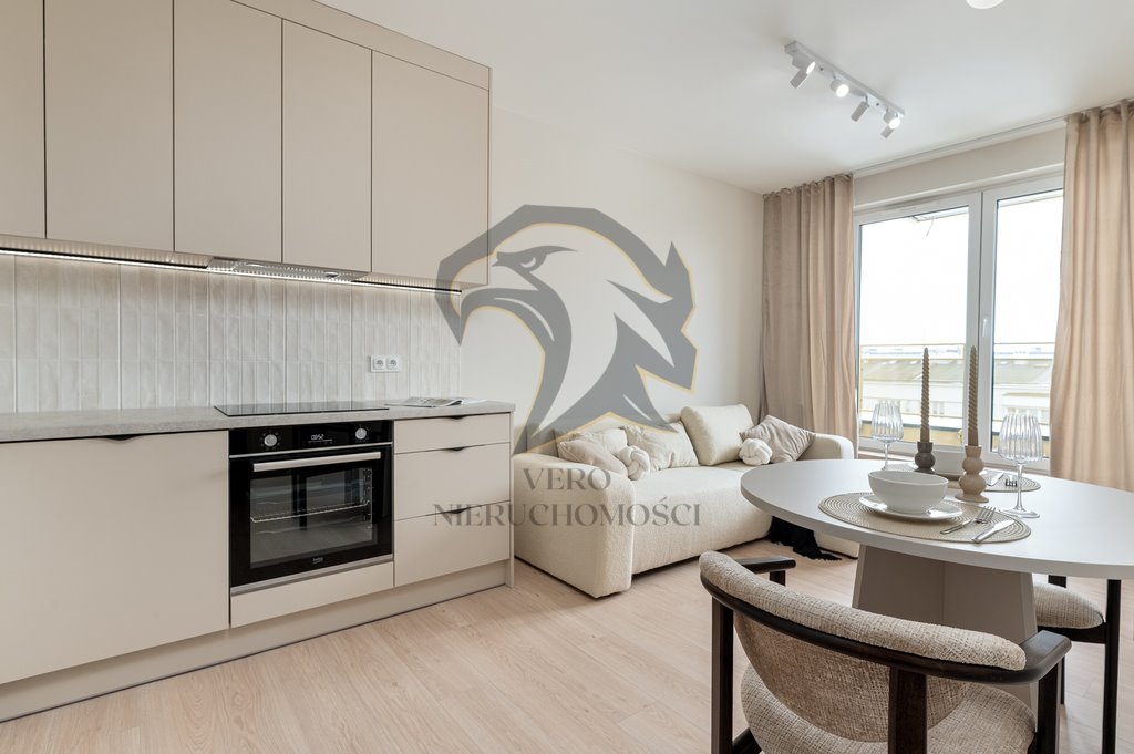 - jasny salon z aneksem kuchennym, elegancki, spójny i gotowy na codzienne życie oraz spotkania,