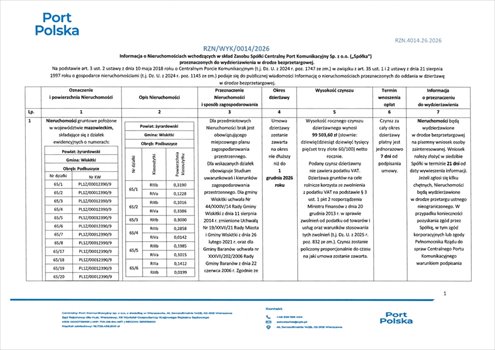 Informacja o nieruchomościach, wchodzących w skład Zasobu Centralny Port Komunikacyjny Sp. z o.o. ("Spółka"), przeznaczonych do wydzierżawienia w drodze bezprzetargowej