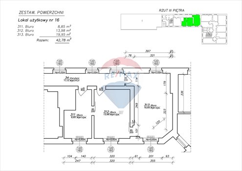 Lokal nr 16, położony jest na trzecim piętrze budynku i składa się z 3 pomieszczeń biurowych o łącznej powierzchni 42,78 m2.