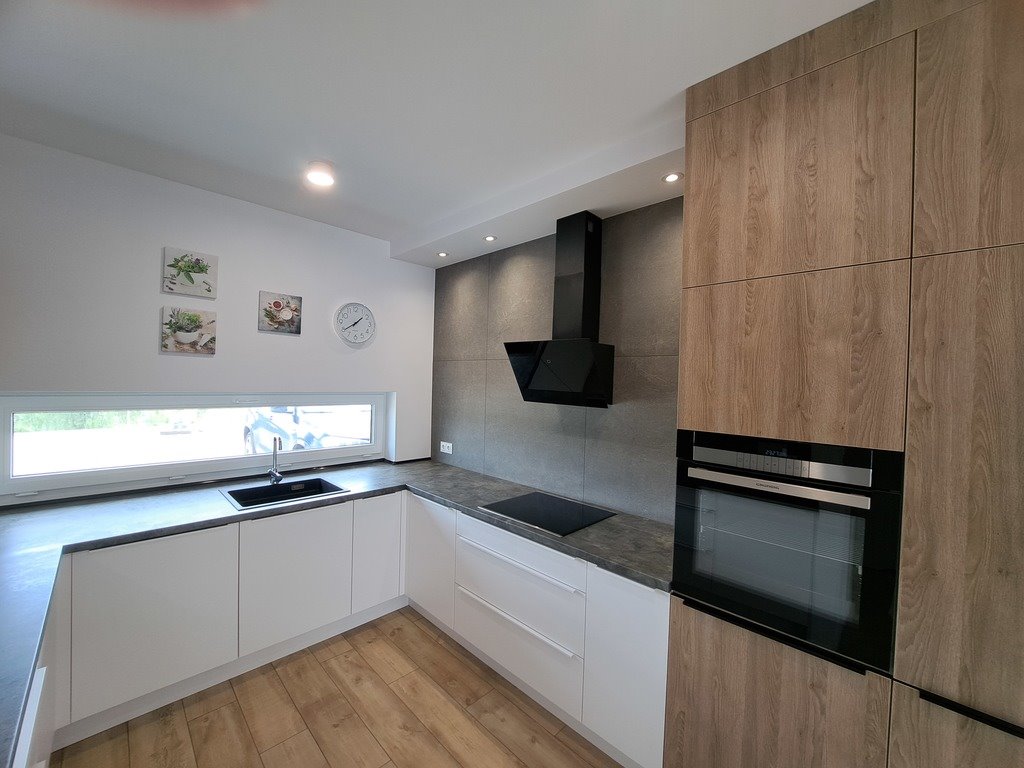 Dom składa się z salonu połączonego z kuchnią, toalety, dwóch pomieszczeń gospodarczych - na pierwszej kondygnacji. Drugą stanowią trzy sypialnie, garderoba oraz łazienka z wanną i kabiną prysznicową. Dodatkową powierzchnię stanowi strych, który z powodzeniem możemy wykorzystać do przechowywania. Całość wykończona w wysokim standardzie, użyto materiałów wysokiej klasy.