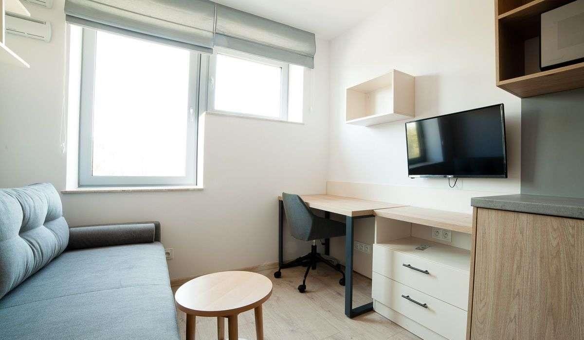 Wyposażenie lokalu: łóżko dwuosobowe rozkładane w salonie, aneks kuchenny (kuchnia indukcyjna), łazienka z prysznicem, biurko, TV32, podłączenie do internetu (należy kupić własny ruter lub kabel), klimatyzacja, ogrzewanie.