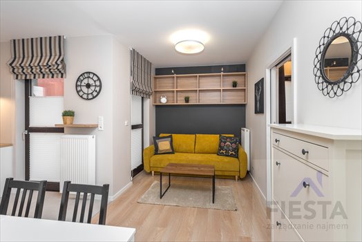 Mieszkanie o powierzchni 35m2, wykończone i wyposażone w bardzo dobrym standardzie. Pokój dzienny z aneksem kuchennym. W pokoju kanapa, stół z krzesłami, ława, półki i telewizor. Kuchnia w pełni umeblowana i wyposażona w cały sprzęt AGD. Sypialnia z łóżkiem małżeńskim oraz garderobą. W przedpokoju duża szafa wnękowa. Łazienka z kabiną prysznicową, podgrzewaną podłogą i pralką.