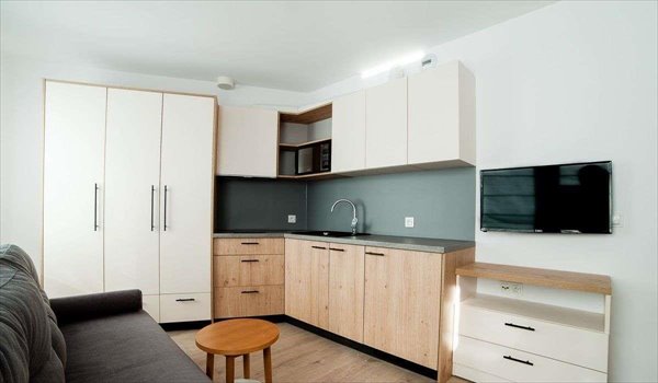 Wyposażenie lokalu: łóżko dwuosobowe rozkładane w salonie, aneks kuchenny (kuchnia indukcyjna), łazienka z prysznicem, biurko, TV32, podłączenie do internetu (należy kupić własny ruter lub kabel), klimatyzacja, ogrzewanie.