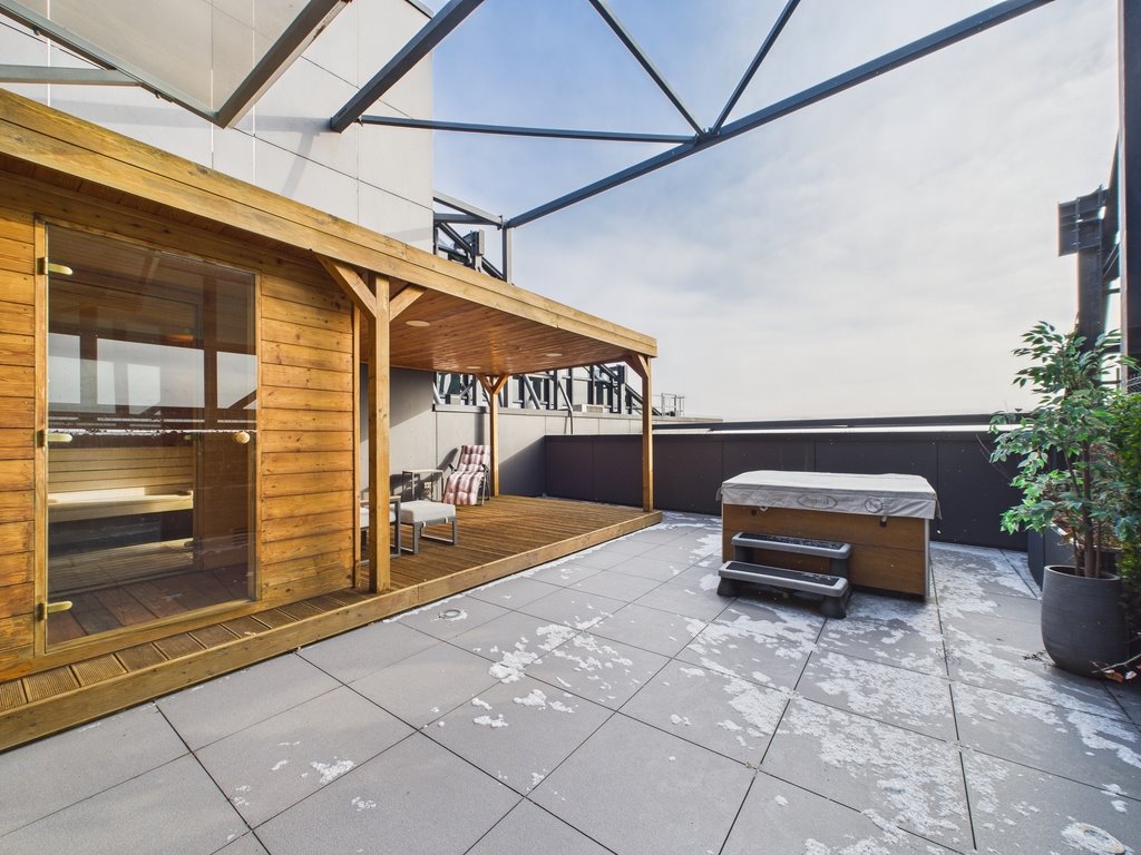 Additionally, the apartment features a large terrace of approximately 60 sqm with a sauna and jacuzzi. It is worth noting that only a few apartments in the entire building have a private terrace. The living room offers a spectacular view—both in the morning at sunrise and in the evening, when you can enjoy the city lights while relaxing on the sofa.