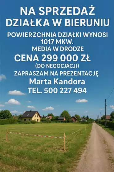 TYLKO W WADER NIERUCHOMOŚCI Mam przyjemność zaoferować Państwu na sprzedaż działkę w Bieruniu. Powierzchnia działki wynosi 1017...