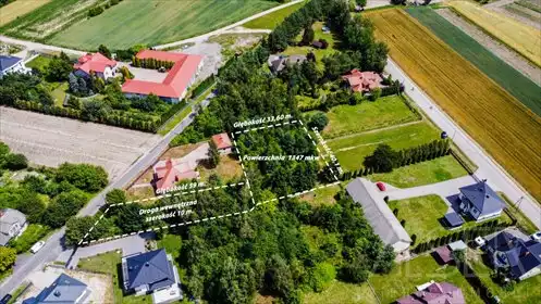 Działka w kształcie prostokąta o powierzchni 1347 m2. Jej wymiary to 33.60 metrów szerokości na 40.1 metrów głębokości w drugi...