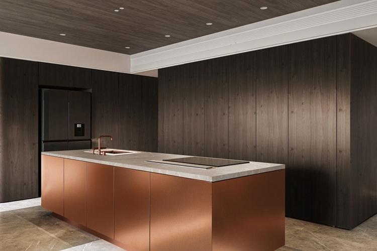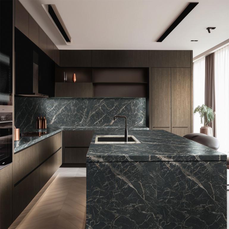 Kontrapunktem dla marmuru jest eleganckie, ciemne drewno, które ociepla przestrzeń i dodaje jej naturalnego uroku. W tej roli idealnie sprawdzają się Orzech Willa PD5014 oraz Dąb Millenium PD3117. W towarzystwie subtelnych beżów, głębokiej czerni i złocistej szczotkowanej stali (dekor Inox Miedź PF8032 oraz Inox Beż PF8030), całość nabiera klasy i finezji. To zestawienia dekorów, które urzekają swoją harmonią i idealnie się uzupełniają.