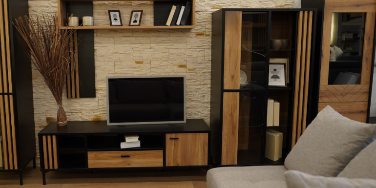 Salon japandi wymaga porządku. A jak wiadomo – sprzęt elektroniczny i kable to jego najwięksi wrogowie. Dlatego szafka RTV powinna być: