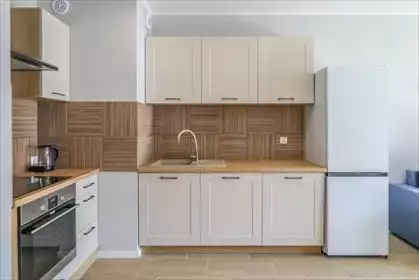 Dwupokojowe mieszkanie z ogródkiem przy ul. Wędrownej Aneks kuchenny połączony z salonem: zabudowa kuchenna, sprzęt AGD (lodówka...