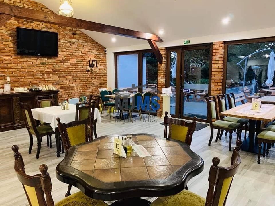 Oferowana nieruchomość to działka o powierzchni aż 7000m 2 , dająca duże możliwości rozszerzenia prowadzonej działalności, obecnie zabudowana dobrze prosperującą, całoroczną, w pełni wyposażoną i klimatycznie urządzoną restauracją oraz budynkiem mieszkalnym o łącznej powierzchni 250m 2 wraz z zadaszonym zapleczem (120m 2 ), drewnianą wiatą o powierzchni 192m 2 , mieszczącą ok. 200 osób wraz z zapleczem (66m 2 ), w którym wygospodarowano miejsce na toalety, szatnię oraz zaplecze kuchenne. W okresie letnim goście mają możliwość spożywania posiłków na tarasie, który pomieści siedem 8-osobowych stolików. Sala restauracyjna obejmuje dziesięć 6 osobowych stolików, a mniejsza z barem cztery 4 osobowe. W budynku znajduje się również toaleta damska i męska. Obiekt dający możliwość organizowania imprez okolicznościowych, wesel czy bankietów oraz imprez plenerowych.