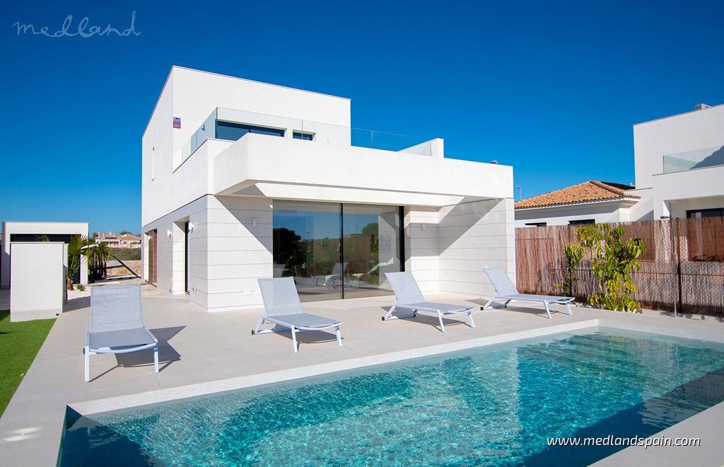 New development of villas located in La Herrada, a residential area of the municipality of Los Montesinos, and within walking distance of the town centre and all the necessary services for day to day living. Just a few minutes’ drive to the north lies Ciudad Quesada, and 5 minutes’ drive to the south, is the city of Torrevieja. The fabulous beaches of Guardamar are only 10 minutes away by car.The project offers South-facing villas in different models, built on plots from 367m2-536m2. Choose between a villa with 3 bedrooms and 2 bathrooms, on one or two levels, or a two-storey villa with 4 bedrooms and 3 bathrooms. All the villas have a large open-plan area combining the lounge, dining and kitchen area, with access to two terraces, a garden and a private pool. All master bedrooms have a private bathroom.The villas are constructed with high quality materials and are delivered with fully installed ducted A/C, kitchen appliances, underfloor heating in the bathrooms, lighting, a private pool and parking on the premises.