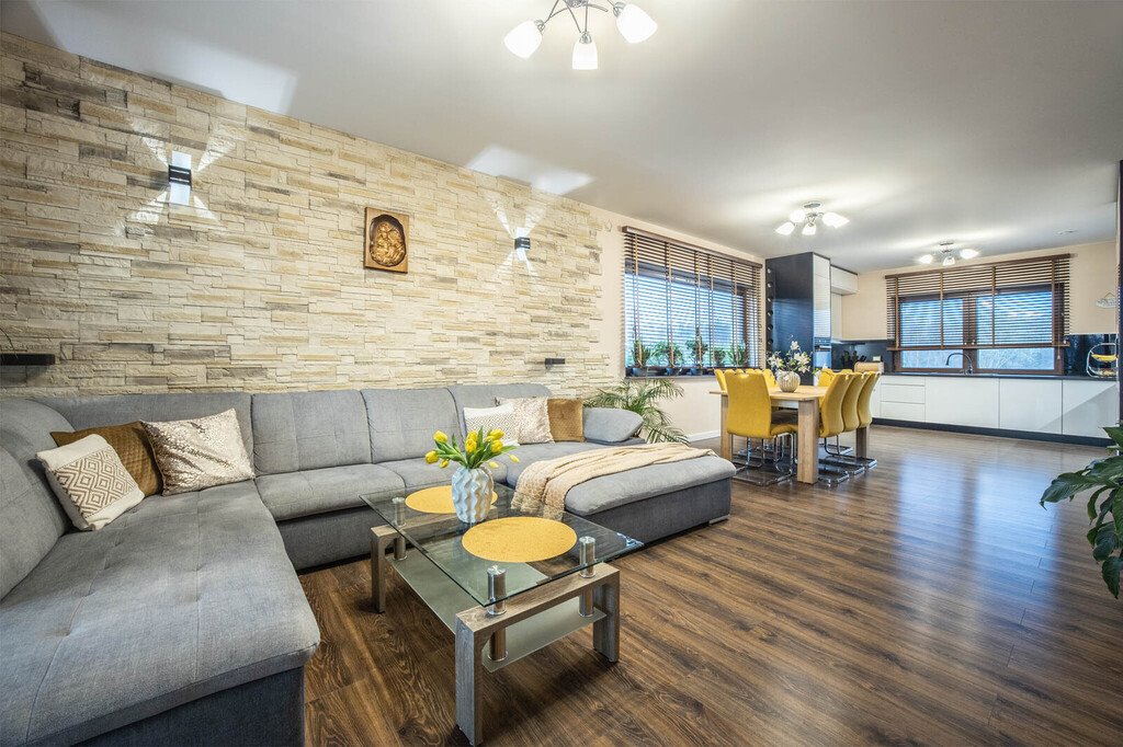 - Przestronnego salonu z aneksem kuchennym