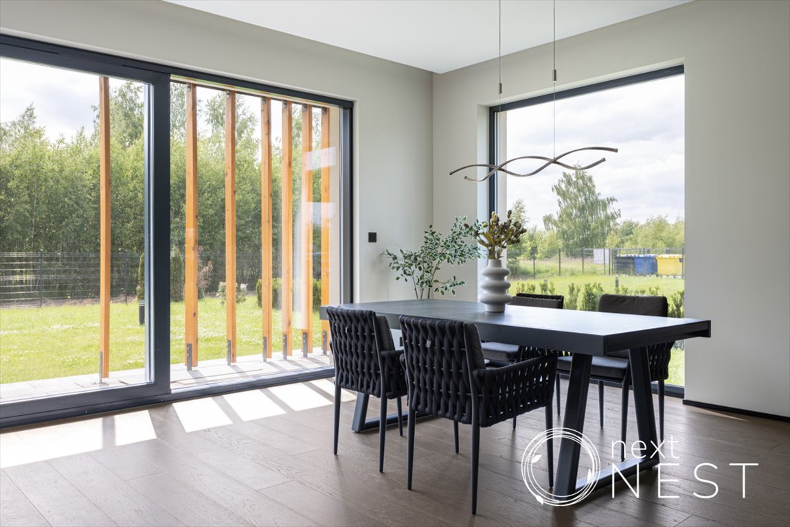 Piętro: trzy sypialnie, dwie łazienki, garderoba i hol oraz dwa balkony z przeszklonymi balustradami. W budynku zamontowane są duże okna aluminiowe panoramiczne. Budynki ogrzewane są pompą ciepła Hitachi i rozprowadzone jest w całym domu ogrzewanie podłogowe.