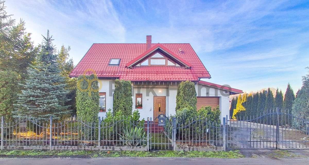 Ogród jest pięknie zagospodarowany. Front domu obsadzony iglakami, natomiast z tyłu domu można znaleźć drewnianą wiatę, drzewa owocowe oraz zadbany trawnik. Cała działka jest ogrodzona.