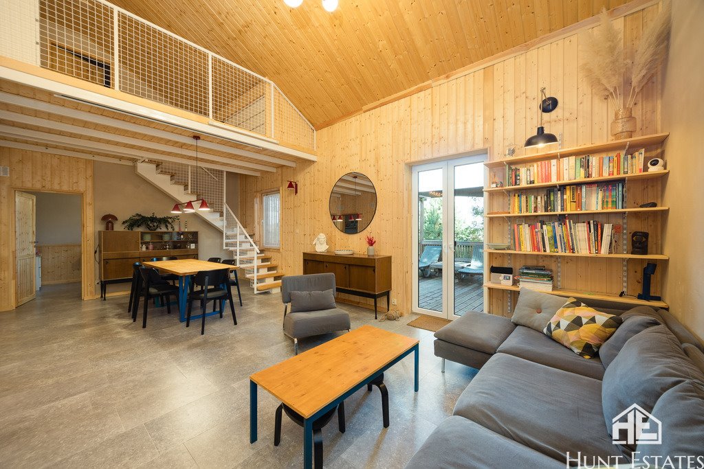 Na piętrze antresola na salon oraz dwie sypialnie.