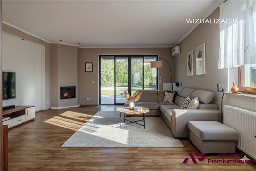 Sercem domu jest jasny salon (prawie 37 m²) z dużym przesuwnym oknem prowadzącym na taras i do ogrodu. To przestrzeń, w której toczy się codzienne życie: wspólne posiłki, spotkania, czas z rodziną. Jest kominek oraz klimatyzacja.