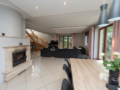 Dom z 2005 roku, więc wymaga odświeżenia, ale wykonany jest z dobrej klasy materiałów: Porotherm, docieplony wełną mineralną, okna trzyszybowe drewniane, kominek otoczony marmurem, reprezentacyjne, drewniane schody, dobrze wyposażona kuchnia (sprzęty firmy Bosh), na piętrze podłogi drewniane - dębowe.