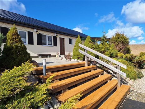 Przestronny parterowy dom o powierzchni użytkowej 110 mkw. Jest on usytuowany na lekkim wzniesieniu i otoczony ozdobną zielenią. Trzy sypialnie są dostępne z podłużnego korytarza, do którego wchodzi się przez wiatrołap. Po południowej stronie domu znajduje się duży salon z długim aneksem kuchennym i stołem jadalnianym. Budynek mieszkalny jest w konstrukcji drewnianej, szkieletowej, bardzo dobrze docieplony (w ścianach 15 cm wełny + 10 cm styropianu od zewnątrz). Ogrzewanie za pomocą kaloryferów oraz podłogowe w łazience i WC. Na zewnątrz od strony ogrodu, znajduje się duży taras z wiatą wypoczynkową.
