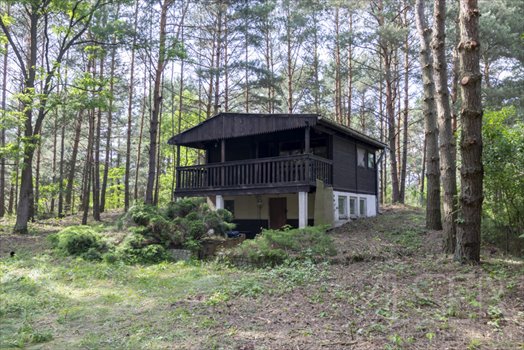 Dom letniskowy wybudowany w latach osiemdziesiątych, parter murowany/piętro w konstrukcji drewnianej. Budynek o powierzchni po podłodze 58,27 m2. Na parterze wysokość pomieszczeń wynosi 1,90 m. (do belki) i 2 m. do sufitu. Wysokość na piętrze wynosi 2,88 m. w najwyższym punkcie, a 2,34 m. w najniższym. Dom na parterze składa się z salonu, kuchni oraz łazienki z kabiną prysznicową. W łazience znajduje się również terma elektryczna. Na piętrze znajduje się salon oraz dwie sypialnie. Z salonu wyjdziemy na taras o powierzchni 11,50 m2 z którego to widok rozpościera się na całą działkę. Budynek usytuowany jest na południową stronę świata, dzięki czemu jest słoneczny.