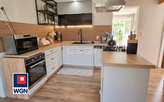 Dom posiada funkcjonalny układ pomieszczeń. Na parterze znajduje się kuchnia z jadalnią, pokój dzienny, sypialnia, łazienka oraz pomieszczenie gospodarcze, w którym zamontowano nowy piec na pellet. Dodatkowym atutem jest wyjście z kuchni bezpośrednio na taras i ogród, co zapewnia wygodę codziennego użytkowania i sprzyja wypoczynkowi na świeżym powietrzu.
