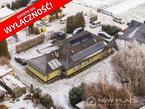 Standard budynku i wykończenia: podłogi panele i płytki, tynki cementowo-wapienne, elewacja ocieplona (styropian) z tynkiem strukturalnym, dachówka betonowa, okna PCV i drewniane. Na dachu panele fotowoltaiczne - mocny argument kosztowy przy obiekcie z wysokim zużyciem mediów.