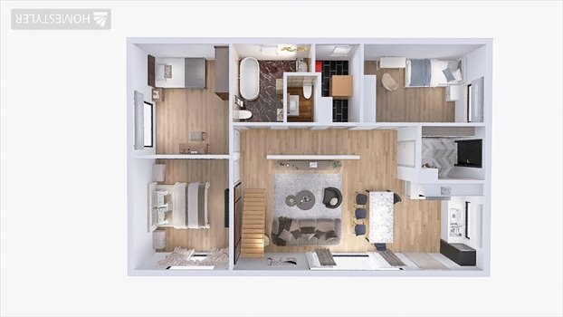 Przestronny salon z aneksem kuchennym stanowi naturalne centrum domu. Duże przeszklenia dodatkowo podkreślają nowoczesny charakter nieruchomości i wzmacniają poczucie przestrzeni. Do dyspozycji przyszłych właścicieli pozostają również trzy ustawne pokoje, łazienka, osobne WC, hol oraz wiatrołap.