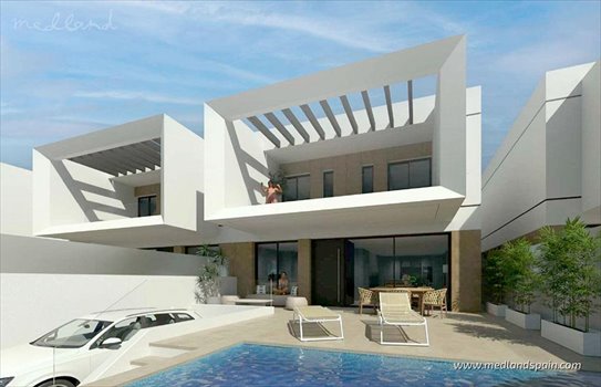 Modern project of semi-detached villas in Dolores, an inland town of the Vega Baja, only 15 minutes from the beach. The town offers a full selection of daily necessities and is only a short drive from the bigger towns in the area, like Almoradí, with a wider variety of services, and sports facilities. The fabulous beaches of Guardamar and La Marina are only 15 minutes away by car. The road network also allows for easy and quick access to other tourist areas, like Torrevieja, Guardamar and Santa Pola, all within 30 minutes’ drive, without forgetting Alicante, and its airport within 40 minutes.The project presents modern semi-detached villas on two floors, with 3 bedrooms and 3 en-suite bathrooms. The spacious living area combines the lounge, a fully equipped kitchen and a dining area, which opens onto a partially covered terrace with private pool area. There is also a guest toilet, and an en-suite bedroom with private patio on the ground floor. The 2 remaining bedrooms, both with a private bathroom, are on the first floor. There is a terrace overlooking the pool off both bedrooms, as well as an uncovered terrace off the first-floor landing.The villas are built with sustainable materials, certifying the project a high energy efficiency rating. Also included is fully installed ducted A/C, white goods, electric blinds in the bedrooms, underfloor heating in the bathrooms, indoor and outdoor LED lighting, solar panels, private pool, garden with artificial grass, and parking on the premises with a motorised entrance gate.