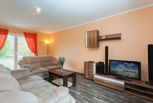 2 sofy, stolik do kawy, szafki, sprzęt RTV i AGD, wyjście na otwarty taras