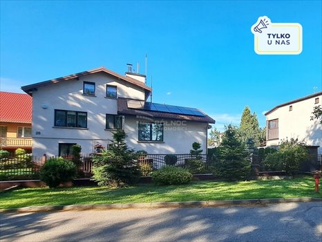 Dom wyróżnia się solidną konstrukcją oraz dachem pokrytym w cześci panelami fotowoltaicznymi.