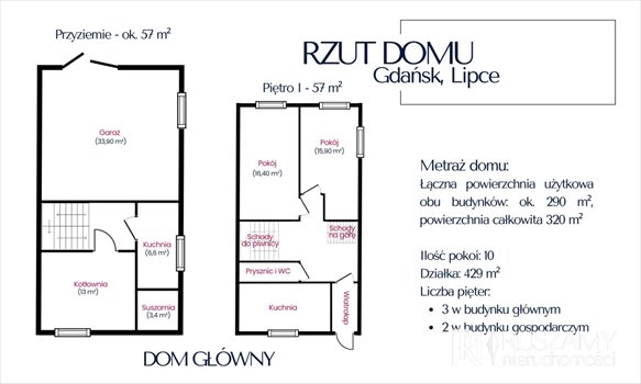 - Łączna powierzchnia użytkowa obu budynków: ok. 290 m², powierzchnia całkowita 320 m²