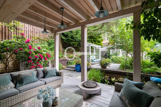 Zrelaksuj się w zielonym zakątku pełnym słońca, cienia i dźwięku wody. Niewielka fontanna, rododendrony, modrzewie - wszystko na delikatnie nachylonym, kaskadowym terenie. To miejsce stworzone do odpoczynku, letnich wieczorów przy grillu, czy zabaw z dziećmi.
