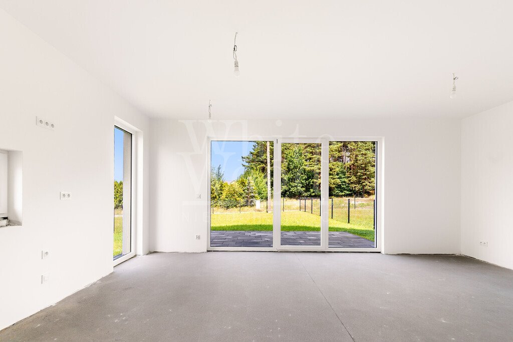 - otoczenie: ogrodzenie z systemu panelowego, podjazd do garażu, chodnik i opaski z kostki betonowej, taras z płyt betonowych, dodatkowe miejsce na auto wysypane kamieniem na geowłóknie, lampy zewnętrzne, trawnik, nasadzenia sosną bośniacką od frontu
