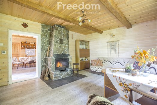 Upon entering the house, we are greeted by a cozy living room with a fireplace equipped with a fan system – the heart of this house, which fills the interior with pleasant warmth on cool evenings.