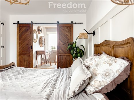 Górna kondygnacja to prawdziwa perełka tej nieruchomości – w pełni wykończona i umeblowana w wyjątkowym stylu, łączącym klasyczną elegancję z nutą francuskiego boho. Znajdują się tu dwie sypialnie (jedna powstała z połączenia dwóch pokoi), w tym przestronna sypialnia z wydzielonym gabinetem. Gabinet oddzielają stylowe drewniane drzwi. Każdy detal wnętrza zachwyca – od odrestaurowanych mebli w stylu vintage (łóżka, biurko, szafka pod telewizor) po nowoczesne zabudowy stolarskie, które idealnie komponują się z całością.