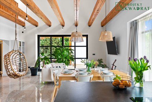 Wnętrze domu zachwyca przestronnością i jasnością. Salon z otwartym stropem i dużymi, trzyszybowymi oknami firmy AluProf wypełnia przestrzeń naturalnym światłem, zapewniając jednocześnie doskonałą izolację termiczną i akustyczną. Dodatkowo, potrójnie szklone okna dachowe Velux z systemem ciepłego montażu BDX gwarantują komfort cieplny przez cały rok.