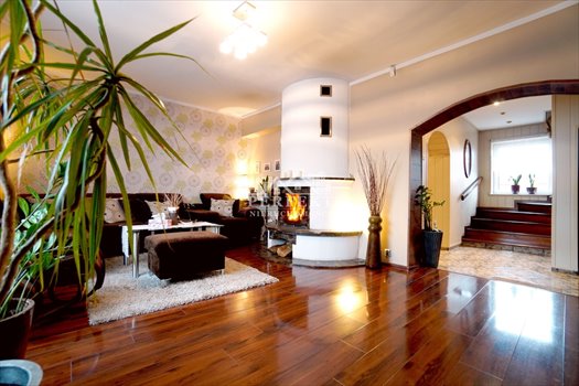 Wysoki parter zajmuje bardzo duży i ustawny salon z kominkiem (na podłodze panele, na ścianach gładź i częściowo tapeta), duża kuchnia z jadalnią wyposażona w zabudowę dębową , płyta ceramiczna, lodówka, zamrażarka, zmywarka; duża łazienka z WC oraz obszerny hol z zabudową z szaf suwanych z lustrami. Na parterze funkcjonuje ogrzewanie podłogowe w pomieszczeniach z terakotą.
