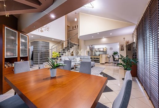 Useable area 166.5 sqm, total 267 sqmlarge garage in the body of the building with automatic openerhouse insulated with polystyrene foam, plastic windowsroof insulated with wool, bitumen roof tilein the kitchen, living room, dining room and bathrooms underfloor heating, radiators in the roomsfrom the living room exit to a large terraceDESIGN - GROUND FLOOR: