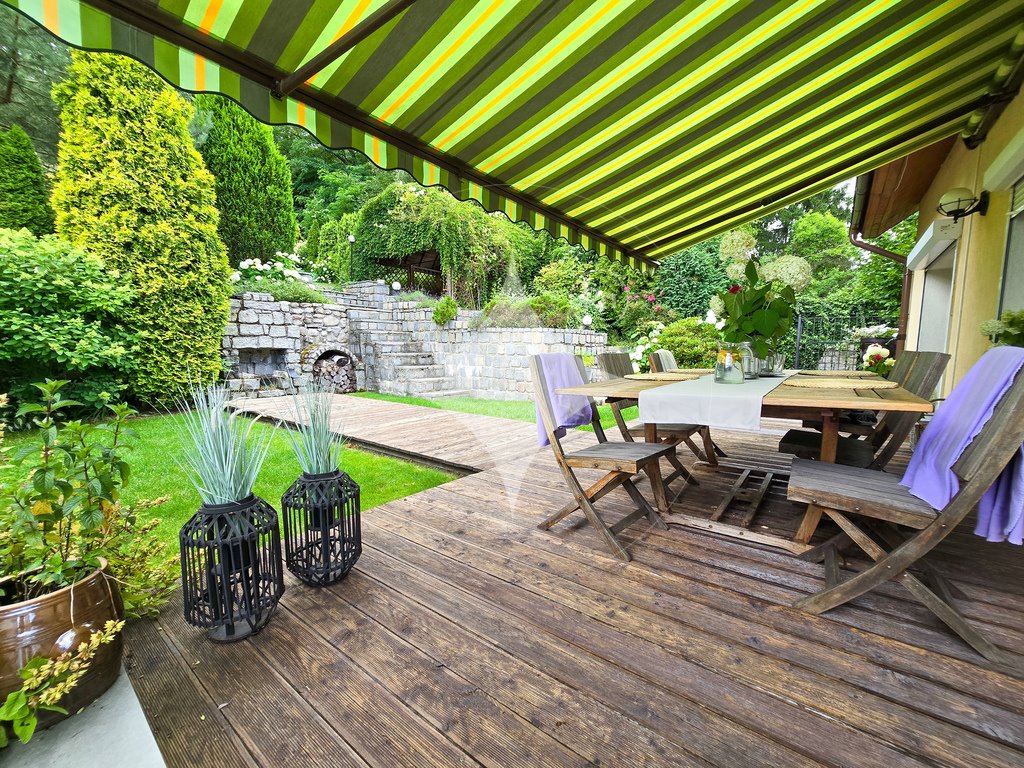 Fenomenalny ogród (4 poziomy) z licznymi nasadzeniami (drzewa, krzewy ozdobne / owocowe, kwiatowe rabaty) daje zastąpione poczucie prywatność i błogiego spokoju wśród otaczającej przyrody. Wprost idealne miejsce do relaksu i odpoczynku po ciężkim dniu.